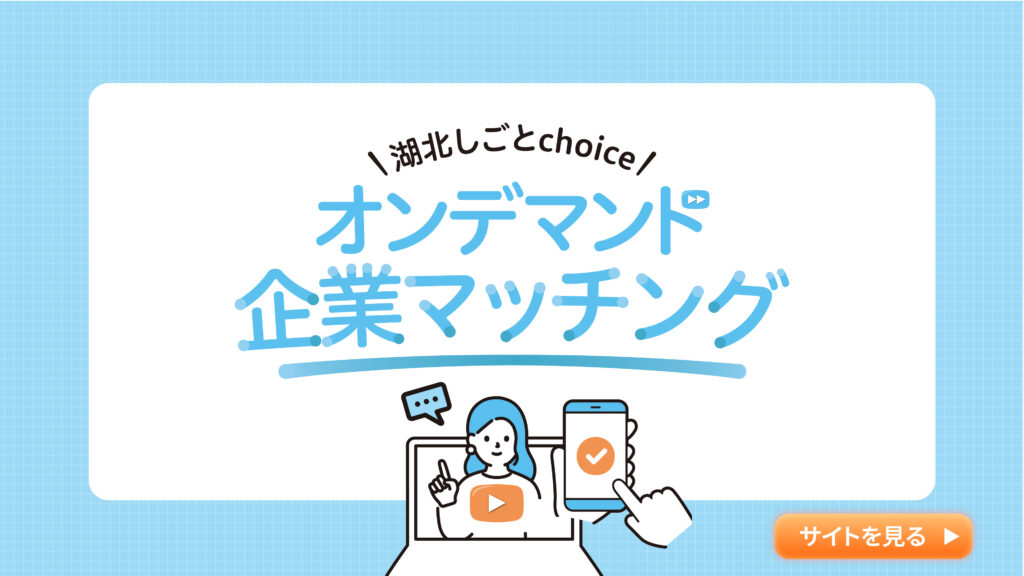湖北しごとchoiceでは、地域の企業を知る動画配信や、企業とのオンライン面談、キャリア相談を通して、あなたの“湖北で働く・暮らす”を具体的に描けるサポートを行っています。