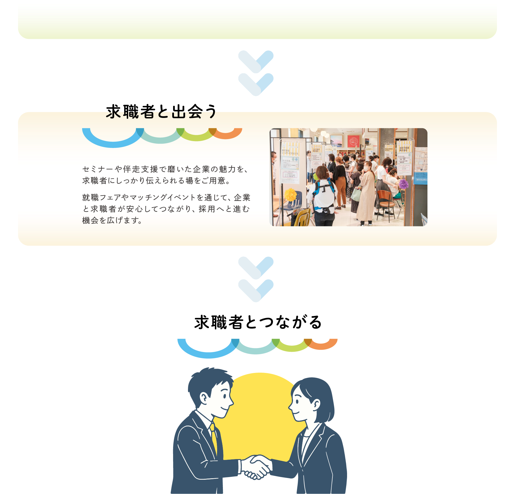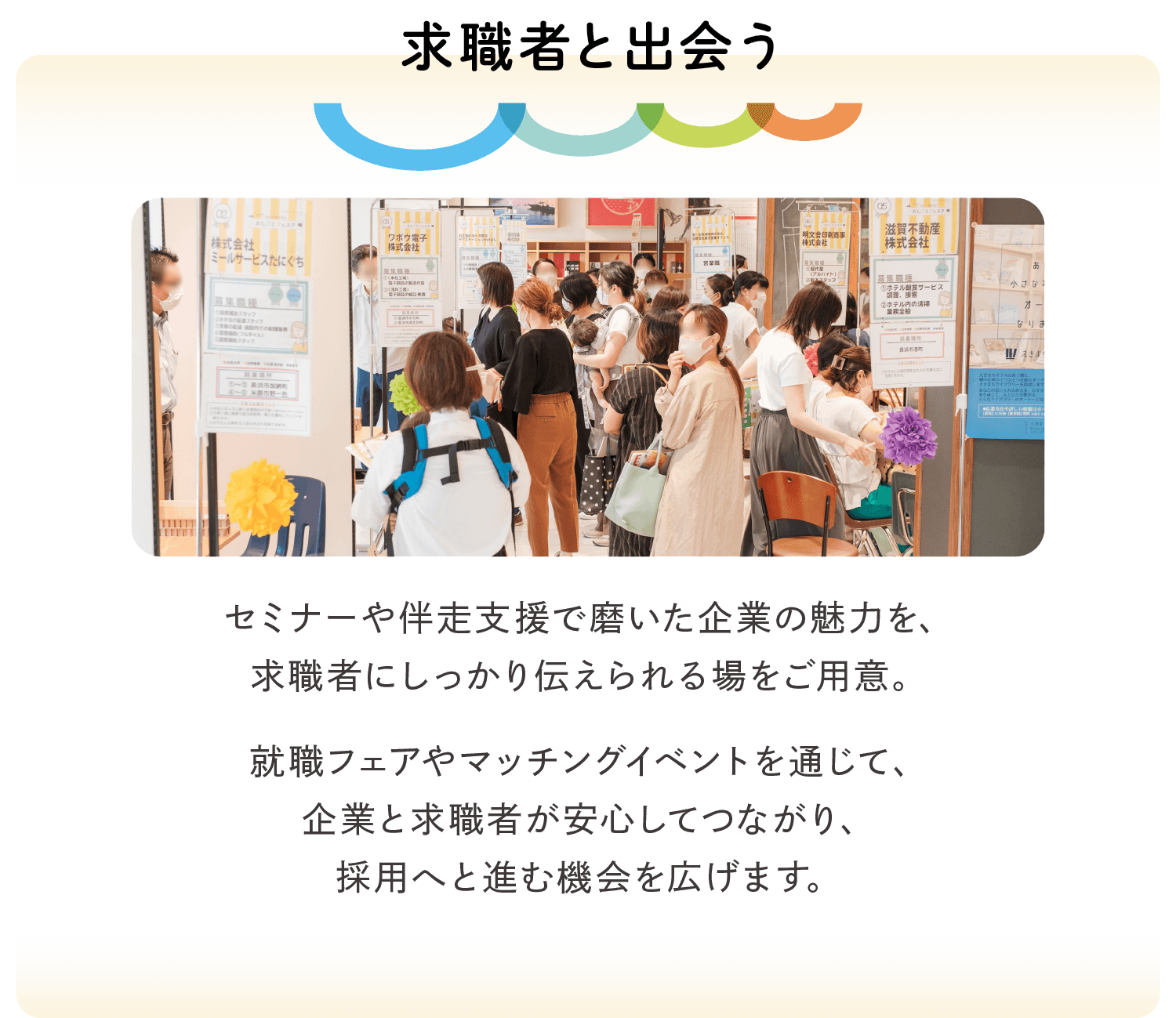 支援で生まれた成功事例や取り組みは地域内で共有し、他企業にも展開。エリア全体の採用力向上と、安定した雇用づくりにつなげます。